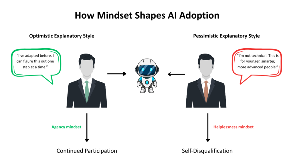 The rise of AI places the concept of learned helplessness at the center of professional evolution. Technology does not inherently create helplessness but it accelerates exposure to the beliefs that already existed beneath the surface. When individuals perceive technological disruption as inevitable, pervasive, and outside their control, they may disengage long before technology has displaced them.